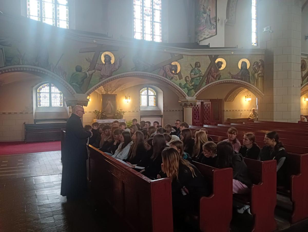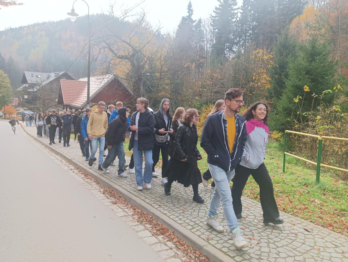 W dniach 28-31 października 2024 roku klasy 8a i 8b pod opieką wychowawców p. Agnieszki Orawiec, p. Pawła Jaworskiego oraz szkolnej psycholog p. Olgi Vyzhdovej wyjechały do Międzygórza poszerzać swoje umiejętności w zakresie języka angielskiego. Pierwszym punktem wyjazdu była wizyta w Kościele p.w. Św. Jacka w Legnicy, aby zobaczyć i usłyszeć o Cudzie Eucharystycznym, który wydarzył się w tej świątyni. Bardzo ciekawie opowiadał o nim ks Andrzej Ziombra proboszcz parafii, który zaproponował wspólną modlitwę przed relikwią.