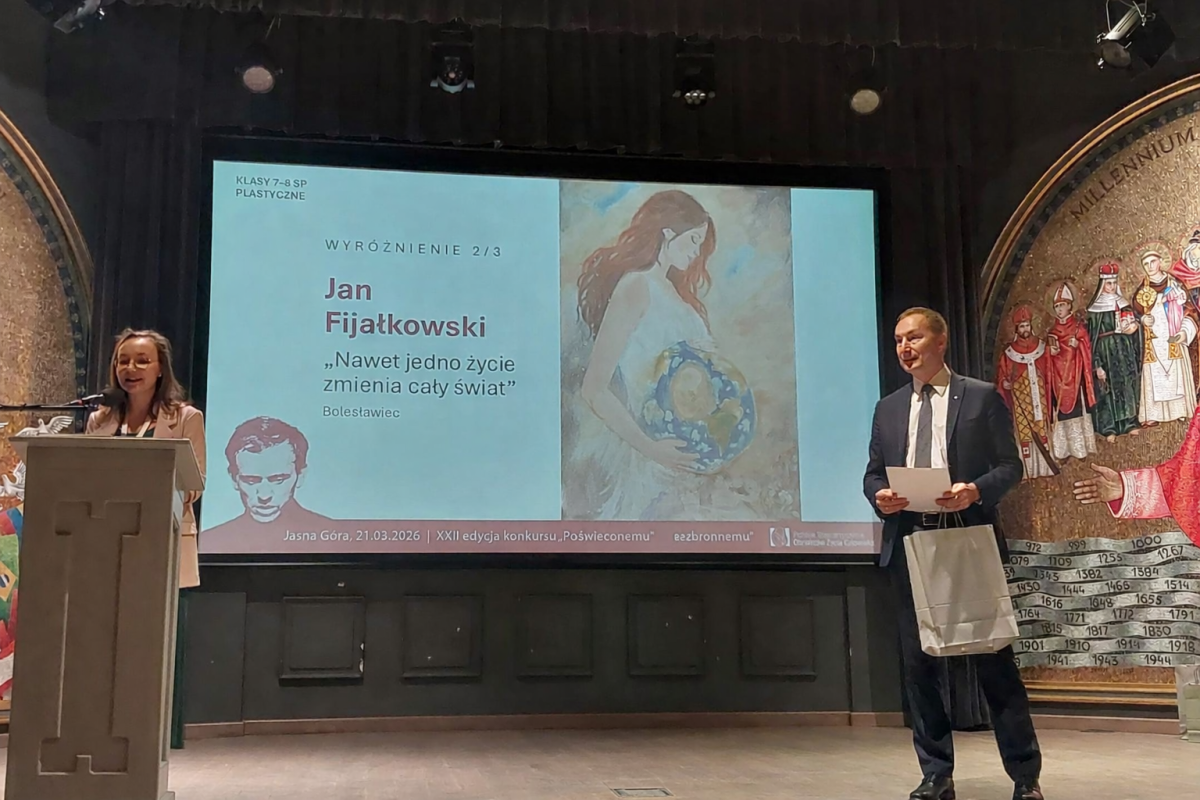 W tym roku po raz pierwszy uczniowie uczniowie naszych Szkół wzięli udział w XXII Ogólnopolskim Konkursie dla Młodzieży „Pomóż ocalić życie bezbronnemu” im. bł. ks. Jerzego Popiełuszki . Konkurs ten organizowany przez Polskie Stowarzyszenie Obrońców Życia Człowieka ma na celu promowanie szacunku wobec daru ,życia oraz jego ochronę od poczęcia, aż do naturalnej śmierci .Młodzi twórcy z szkół podstawowych i średnich swoje przemyślenia mogli wyrazić w formie plastycznej , literackiej lub multimedialnej .Podczas gali finałowej 21 marca na Jasnej Górze, z ponad siedmiuset autorów, nagrodzono tych najlepszych .Ogromnie cieszymy się z wyróżnienia jakie otrzymał Jan Fijałkowski z klasy VIII za pracę „Nawet jedno życie zmienia cały świat”. Gratulujemy z całego serca!