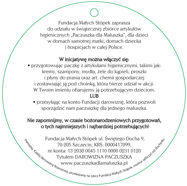 Fundacja Małych Stópek po raz kolejny zaprasza naszą szkołę do udziału w akcji „Paczuszka dla Maluszka”. W ubiegłym roku uszczęśliwiliśmy podopiecznych Domu dla Dzieci NADZIEJA w Lubomierzu. Państwa hojność i zaangażowanie przerosły nasze oczekiwania, a u dzieci wywołały łzy wzruszenia i radości.