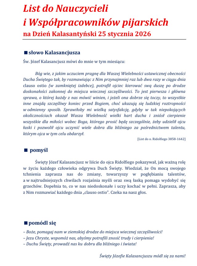 Tutaj jesteś: Strona główna » Aktualności » List na Dzień Kalasantyński 25 stycznia 2026