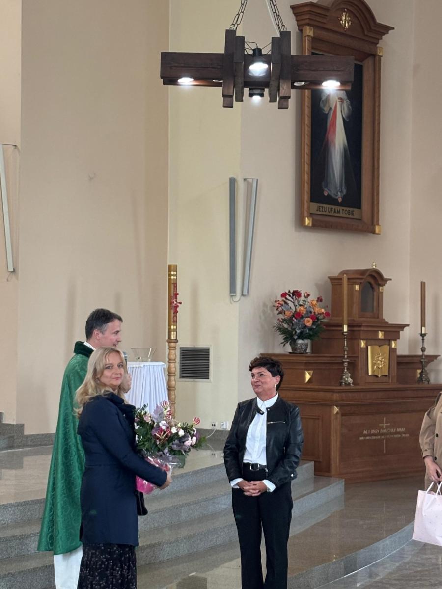 Po Eucharystii podziękowaliśmy też p. Renacie Marszałek, dotychczasowej przewodniczącej Rady Rodziców naszych szkół, za długą, jedenastoletnią pracę na rzecz naszej wspólnoty, za wysiłek i oddanie, poświęcony czas i energię.