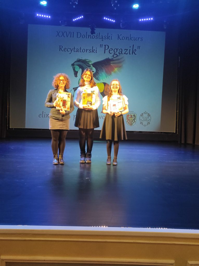 Trzy uczennice naszej szkoły – Alexandra Łabudzki z kl. 4a, Natasza Sztych z kl. 7b oraz Aniela Słotwińska z kl. 7a zostały laureatkami etapu powiatowego Konkursu Recytatorskiego PEGAZIK. Będą one wkrótce reprezentować naszą szkołę i powiat podczas etapu wojewódzkiego.