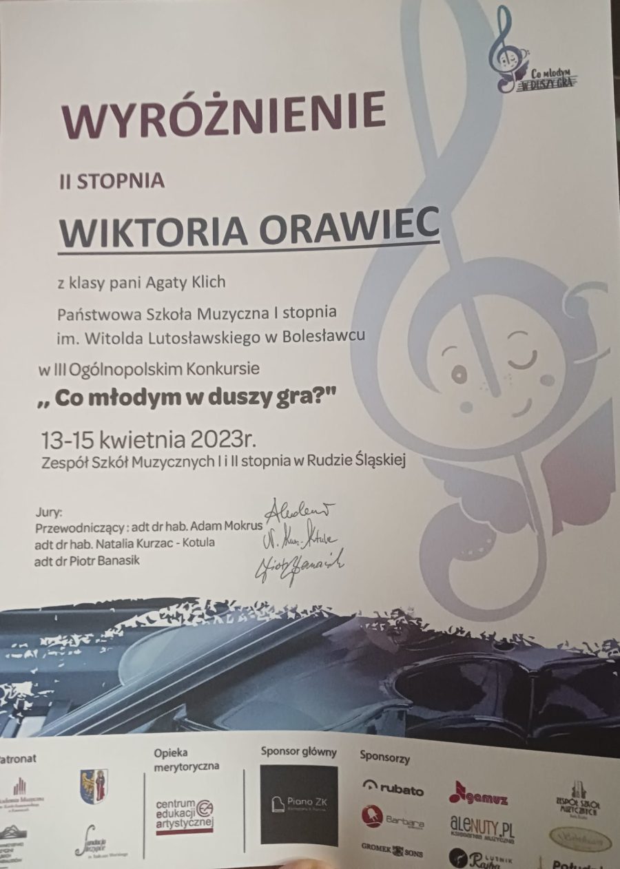 Uczennica klasy siódmej Wiktoria Orawiec zdobyła wyróżnienie w kategorii skrzypiec w III Ogólnopolskim Konkursie „Co młodym w duszy gra?” który odbył się w Rudzie Śląskiej. Wiktoria konkurowała ze 160 młodymi muzykami z całej Polski. Konkurs odbył się w czwartek 13 kwietnia 2023 r.