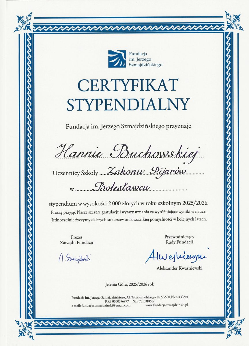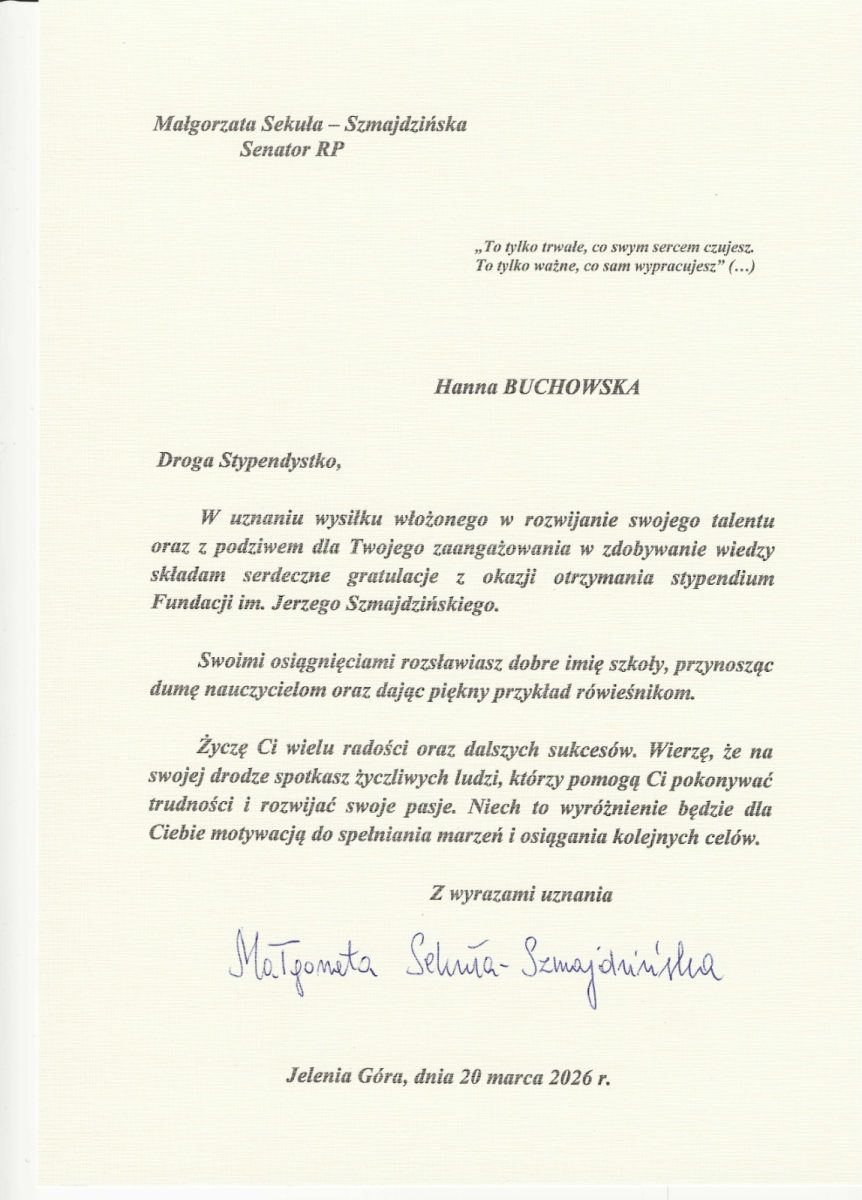 W piątek 20 marca uczennica kl. 6a Hanna Buchowska odebrała w Jeleniej Górze stypendium Fundacji im. Jerzego Szmajdzińskiego.