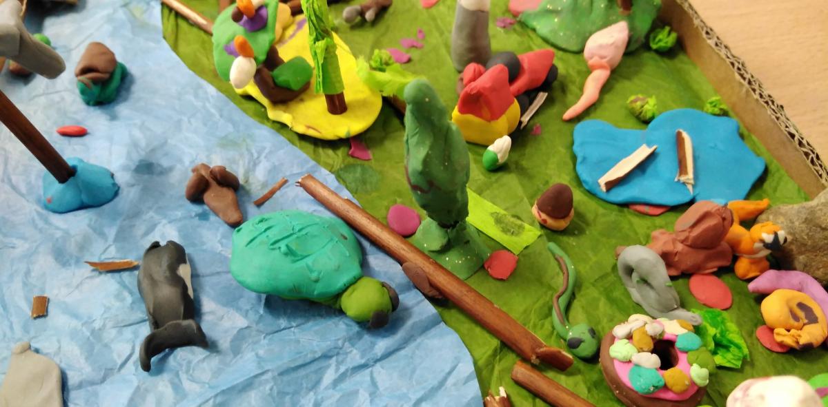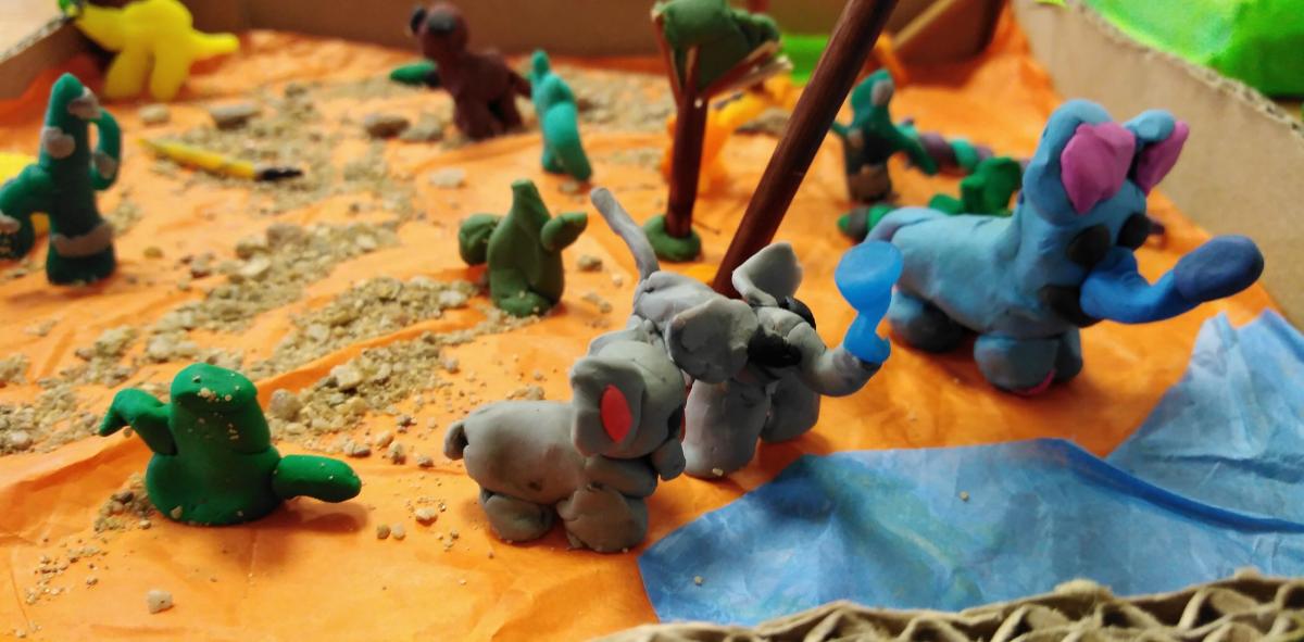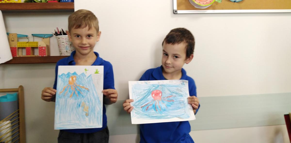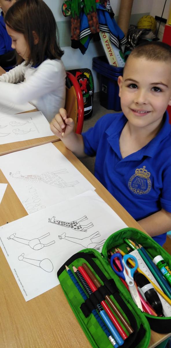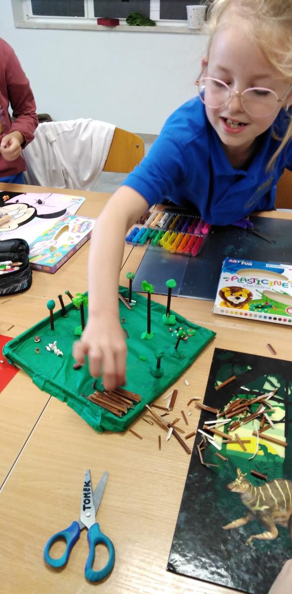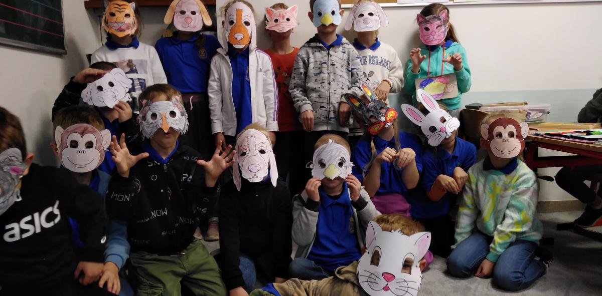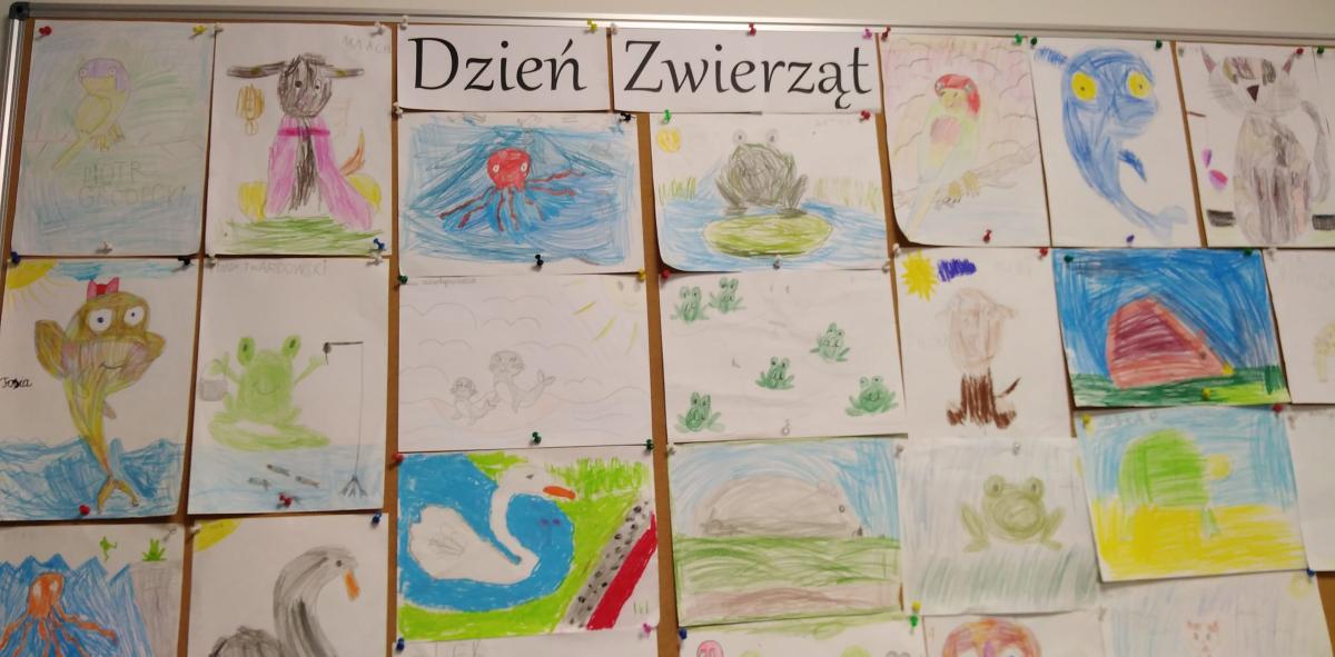 Z okazji Światowego Dnia Zwierząt 6 października w klasie 1b było twórczo i radośnie. Dzieci krok po kroku uczyły się rysować różne zwierzątka. Powstawały żaby, delfiny, kotki, pieski, papugi itp. Mali artyści z ogromnym zaangażowaniem wykonywali makiety ze zwierzątkami hodowlanymi, leśnymi, a nawet żyjącymi w dalekiej Afryce. Na koniec przeistaczali się w poznane gatunki zwierząt, zakładając samodzielnie wykonane maski.