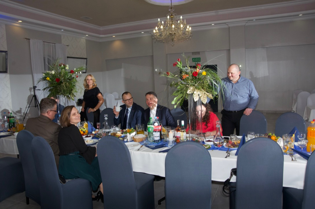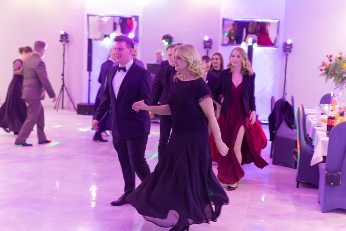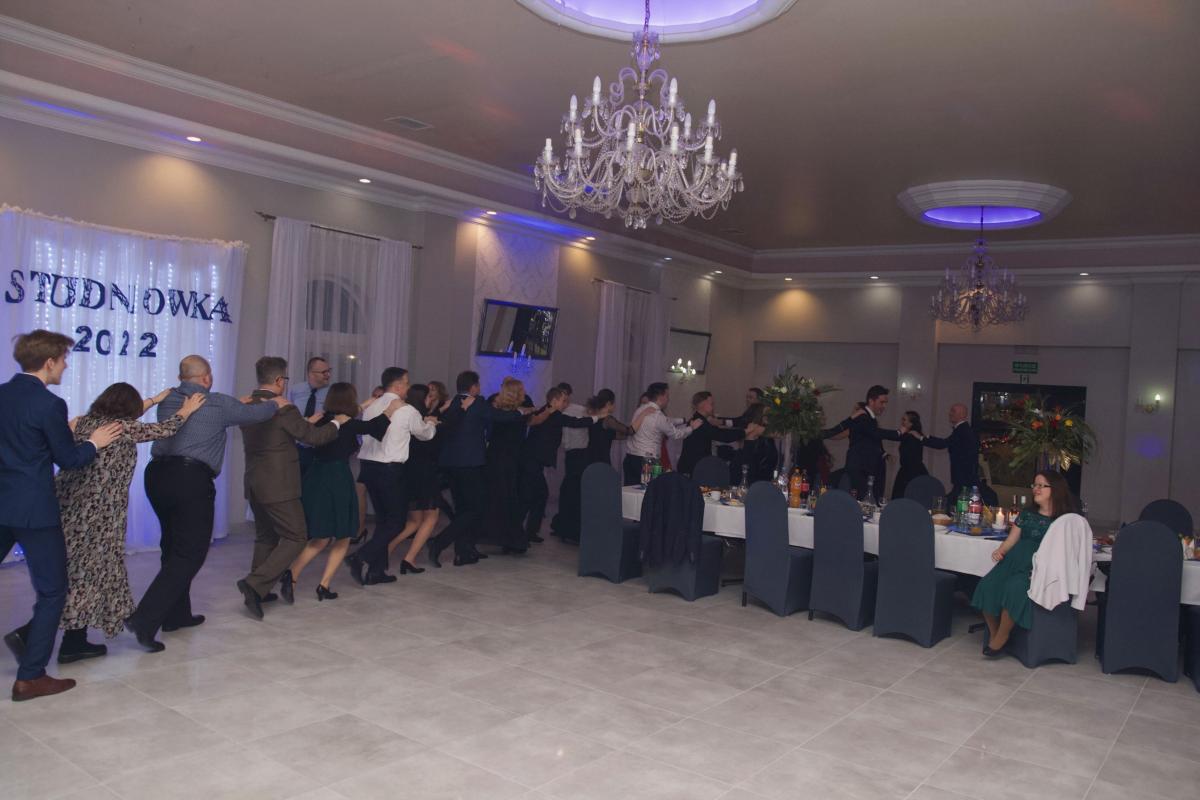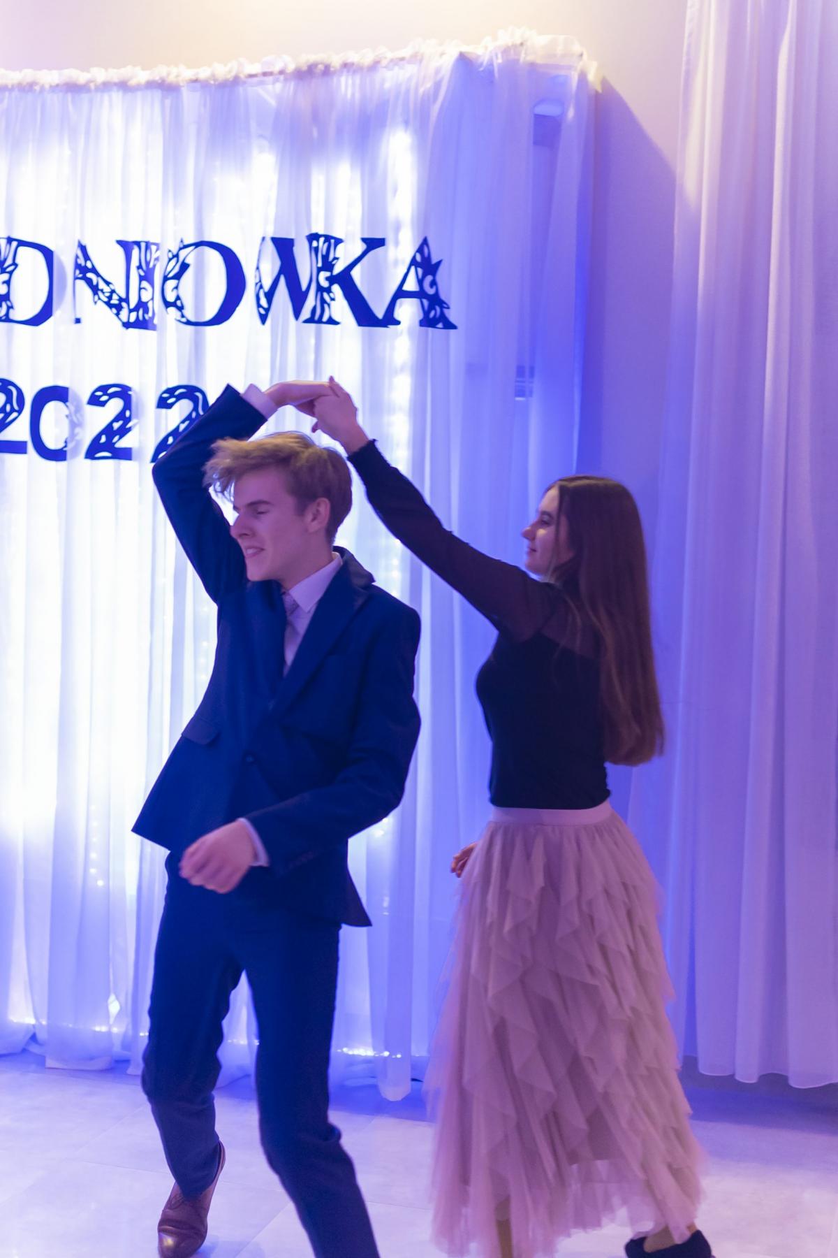 …Ojciec Dyrektor rusza w pierwszej parze, a za nim nasi maturzyści, nauczyciele i osoby towarzyszące, rozpoczynając studniówkowy polonez w IV Publicznym Liceum Ogólnokształcącym Zakonu Pijarów w Bolesławcu. Jednak, zanim ustawiono się do tańca, zebranych 22 stycznia 2022 roku w „Restauracji Europa” w Kruszynie witają o. Marek Kudach i p. Beata Węglarz.
