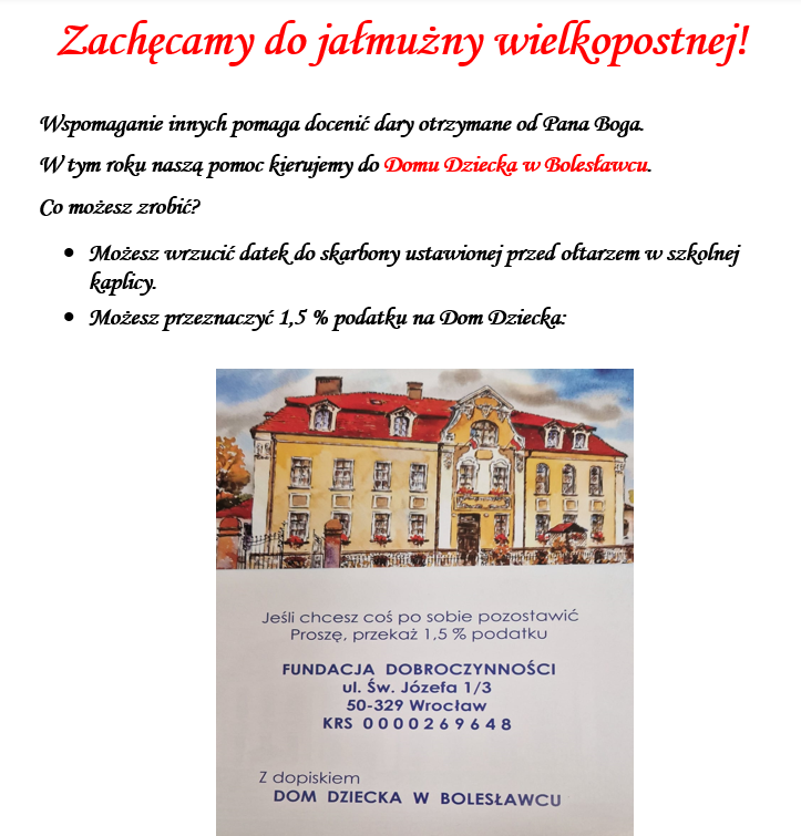 Tutaj jesteś: Strona główna » Aktualności » Wspomóżmy jałmużną wielkopostną bolesławiecki Dom Dziecka