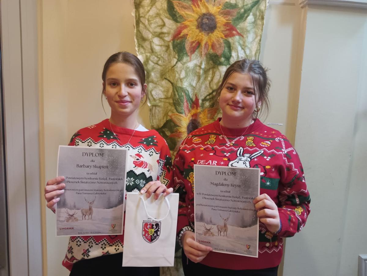 IV Powiatowy Konkurs Kolęd, Pastorałek i Piosenek Świąteczno – Noworocznych odbył się 18 grudnia 2024 roku w Starym Teatrze w Bolesławcu. Naszą szkołę reprezentował duet wokalny Barbara Skupień i Magdalena Krysa. Dziewczyny zaśpiewały piosenkę „Pada śnieg” z rep. E. Górniak i K. Antkowiaka. Swoim dwugłosowym wykonaniem utworu wywalczyły III miejsce w kategorii klas VII-VIII szkół podstawowych.