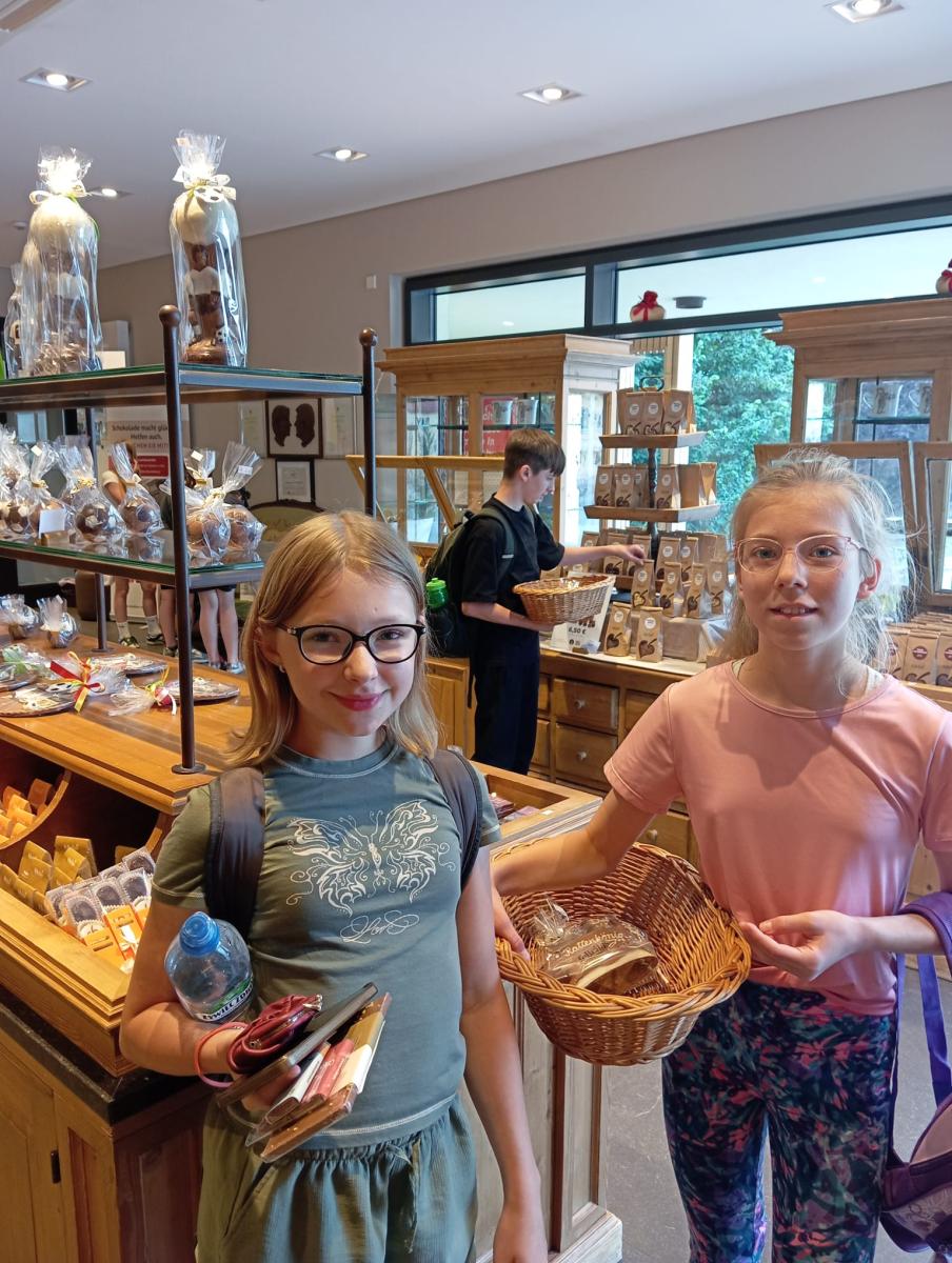 Następnie udaliśmy się do Fabryka Czekolady FELICITAS w Spremberg. W tym wyjątkowym miejscu poczuliśmy się jak w raju. W czekoladowym kinie poznaliśmy historię tego miejsca, a potem zamieniliśmy się w artystów i po wypiciu kubka gorącej czekolady spróbowaliśmy sił w zdobieniu czekoladowych tabliczek. W czasie przerwy od malowania na dworze czekały na nas kozy, króliki, świnki morskie, osioł oraz plac zabaw.