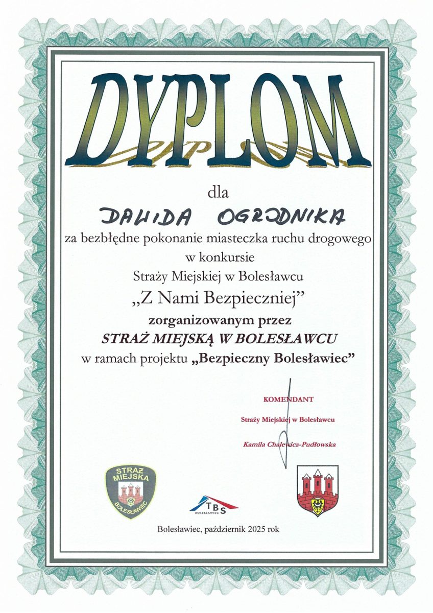 Dodatkowo Dawid Ogrodnik z klasy IV otrzymał Wyróżnienie za najszybsze i bezbłędne przejechanie trasy na placu manewrowym.
