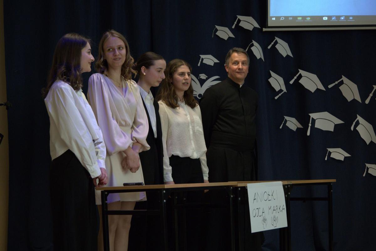 Tradycyjnie nie mogło zabraknąć części artystycznej przygotowanej przez młodszych kolegów. Ciekawy program zaprezentowała klasa 3a LO pod opieką wychowawczyni p. Małgorzaty Szydłowskiej – Nowickiej, który wypełniony był tańcem ( interesujące wykonanie „Jeziora Łabędziego” :), prezentacją zdjęć absolwentów, pięknym wykonaniem piosenki pożegnalnej oraz teleturniejem „Familiada”, w którym „Aniołki Ojca Marka” (dziewczęta) walczyły przeciwko „Akustycznym” (chłopcy), którymi dowodziła wychowawczyni p. Dorota Marusiak. Na pożegnanie absolwenci otrzymali upominki w postaci swoich karykatur, wykonanych przez jedną z naszych byłych uczennic.