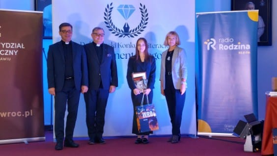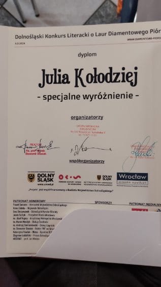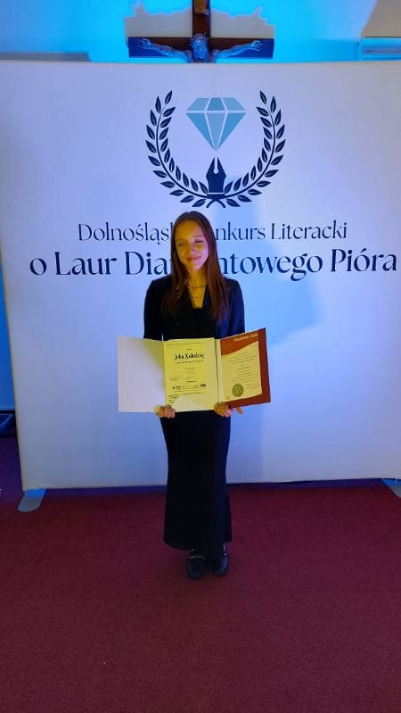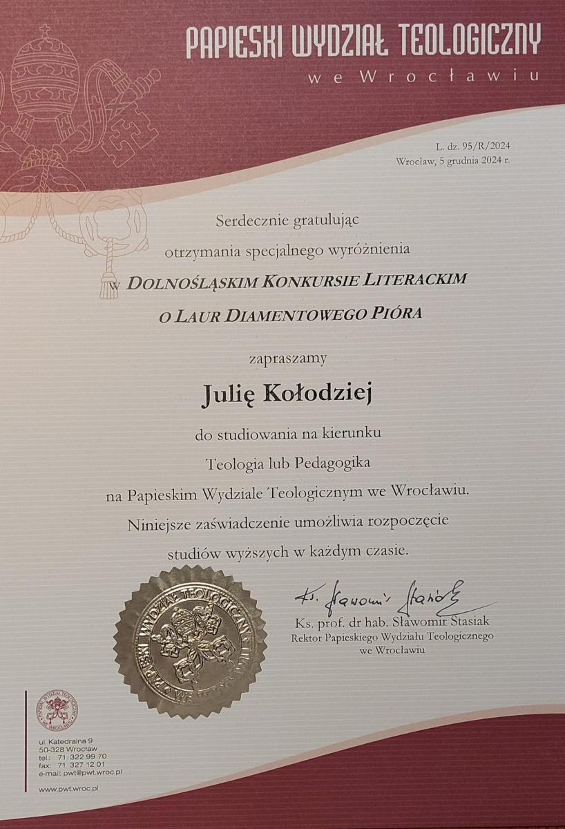 Z wielką dumą i radością informujemy, że uczennica klasy II naszego liceum Julia Kołodziej została Laureatką Nagrody Specjalnej Rektora Papieskiego Wydziału Teologicznego we Wrocławiu w DOLNOŚLĄSKIM KONKURSIE LITERACKIM O LAUR DIAMENTOWEGO PIÓRA. Konkurs skierowany jest do uczniów szkół średnich, techników, szkół branżowych oraz klas ósmych szkół podstawowych województwa dolnośląskiego. Zadaniem uczestników jest napisanie pracy w dowolnej formie (z wyjątkiem poezji) na jeden z czterech zaproponowanych tematów. Nagroda Julii wiąże się z otrzymaniem przez nią indeksu uprawniającego do studiowania na PWT na kierunku teologia lub pedagogika.