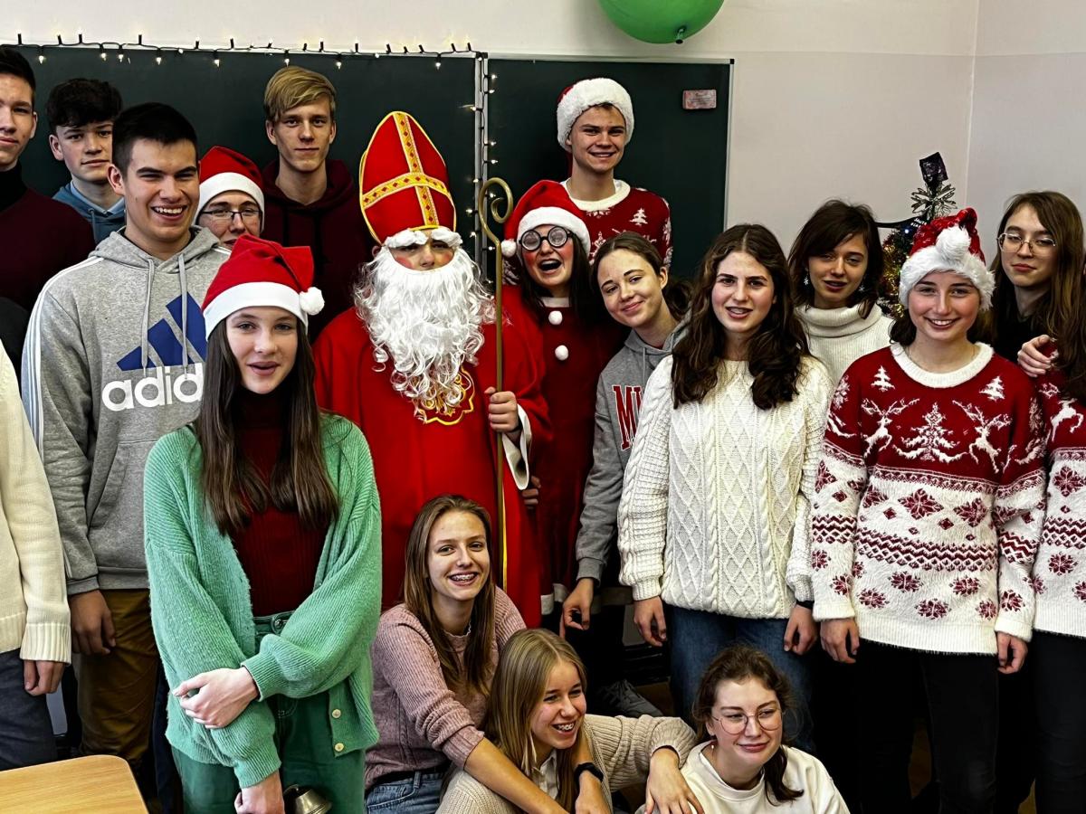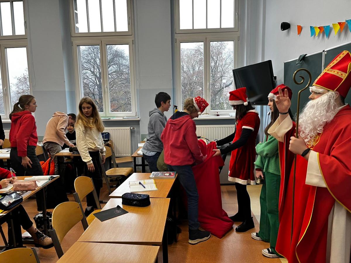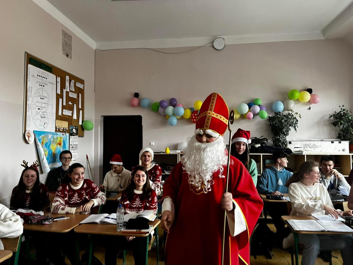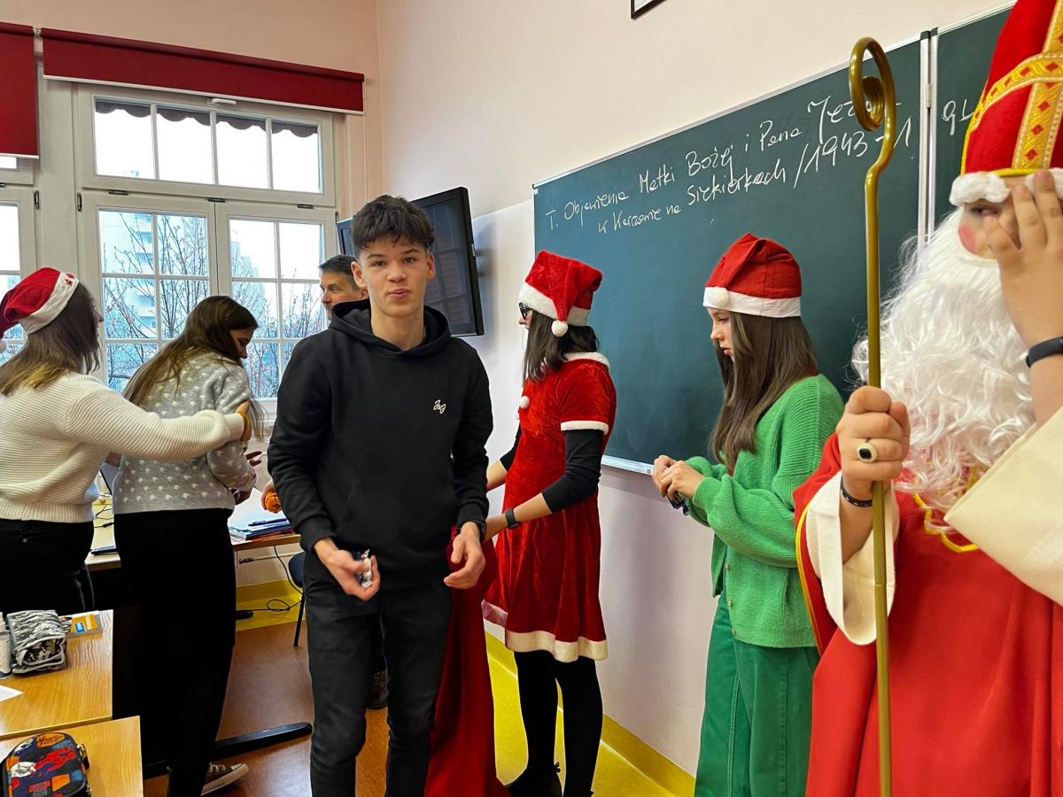 Tegoroczne mikołajkowe święto uczniowie klas I – VIII SP oraz I-IV LO obchodzili bardzo pracowicie. Najpierw przygotowali w swoich klasach gazetki ścienne i dekoracje, na których królowała postać Mikołaja, pisali do Niego listy, potem uczyli się mikołajkowych piosenek.