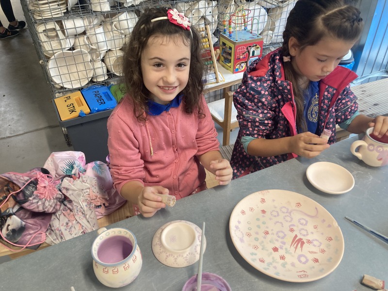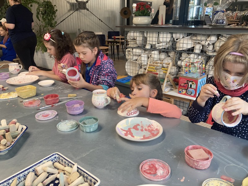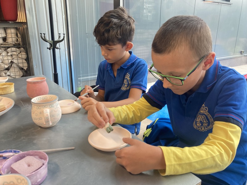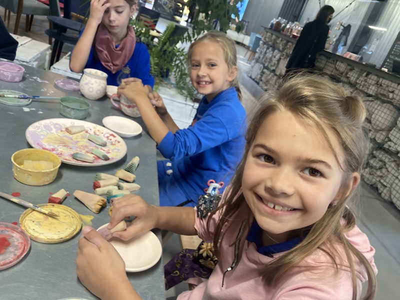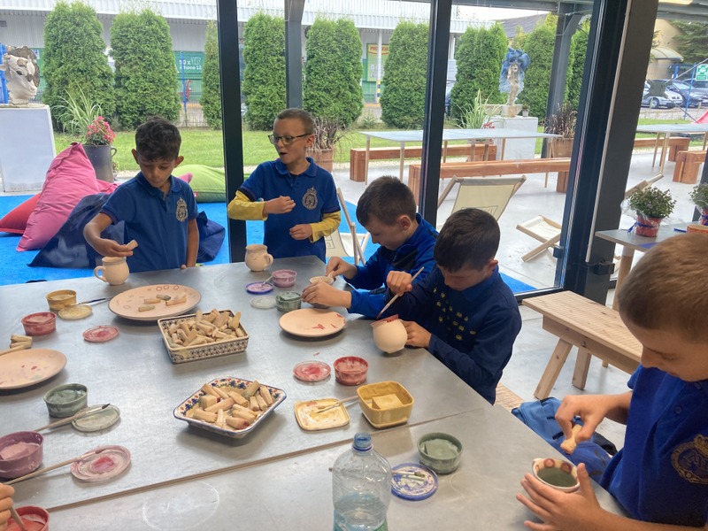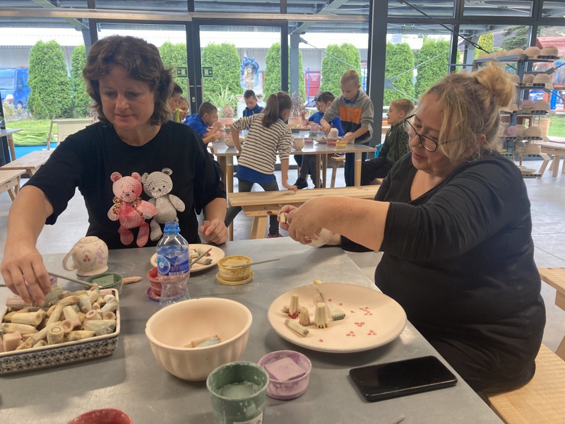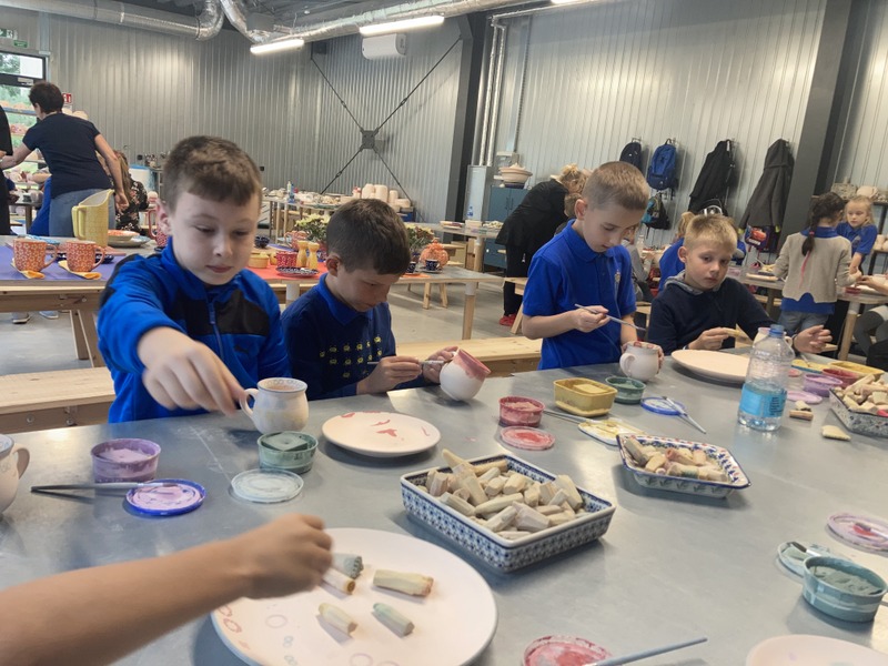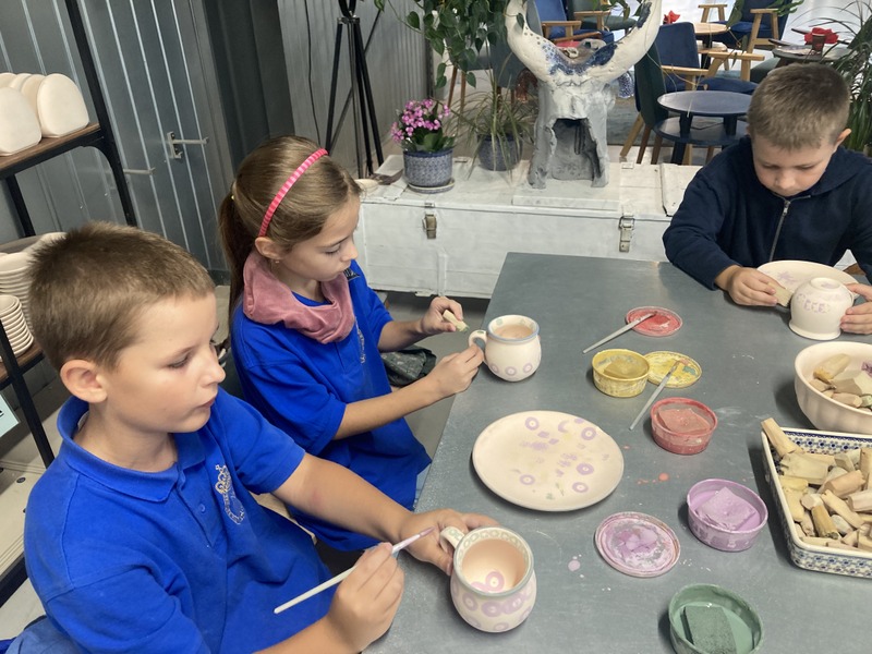 Po zwiedzeniu zakładu wzięliśmy udział w warsztatach malowania ceramiki. Wszyscy otrzymaliśmy biskwitowy kubek i talerzyk oraz zestaw farb, pędzli i stempli. Ochoczo zabraliśmy się do tworzenia własnych, niepowtarzalnych naczyń. Za kilka dni, po szkliwieniu i wypaleniu, naczynia będą dostarczone do szkoły. Czekamy na nie z niecierpliwością! To była bardzo udana wycieczka.