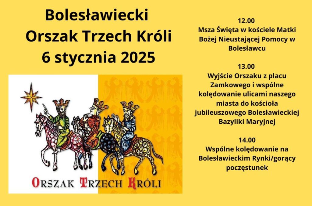 6 stycznia 2025r. w Święto Objawienia Pańskiego tradycyjnie już do Bolesławca zawitają Trzej Królowie 👑👑👑 Zapraszamy rodziny naszej szkoły do udziału w uroczystym orszaku, który wyruszy o godz. 13.00 sprzed kościoła pw. Matki Bożej Nieustającej Pomocy na Placu Zamkowym, gdzie wcześniej – o godz. 12:00 – będzie można wziąć udział w Eucharystii. Orszak przejdzie ulicami miasta do bolesławieckiej bazyliki, gdzie odbędzie się też wspólne kolędowanie. Natomiast w Rynku na uczestników będzie czekać ciepły posiłek.